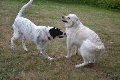 Dixie und ihr Freund spielen fast jeden Tag zusammen. Manchmal sieht es recht gefährlich aus, aber es ist alles nur Spiel. Mal gewinnt der eine, dann wieder der andere. Am Ende sind sie beide wie ausgelaugt. Man kann ihnen die Freude richtig ansehen. Wir sind die besten Freunde.